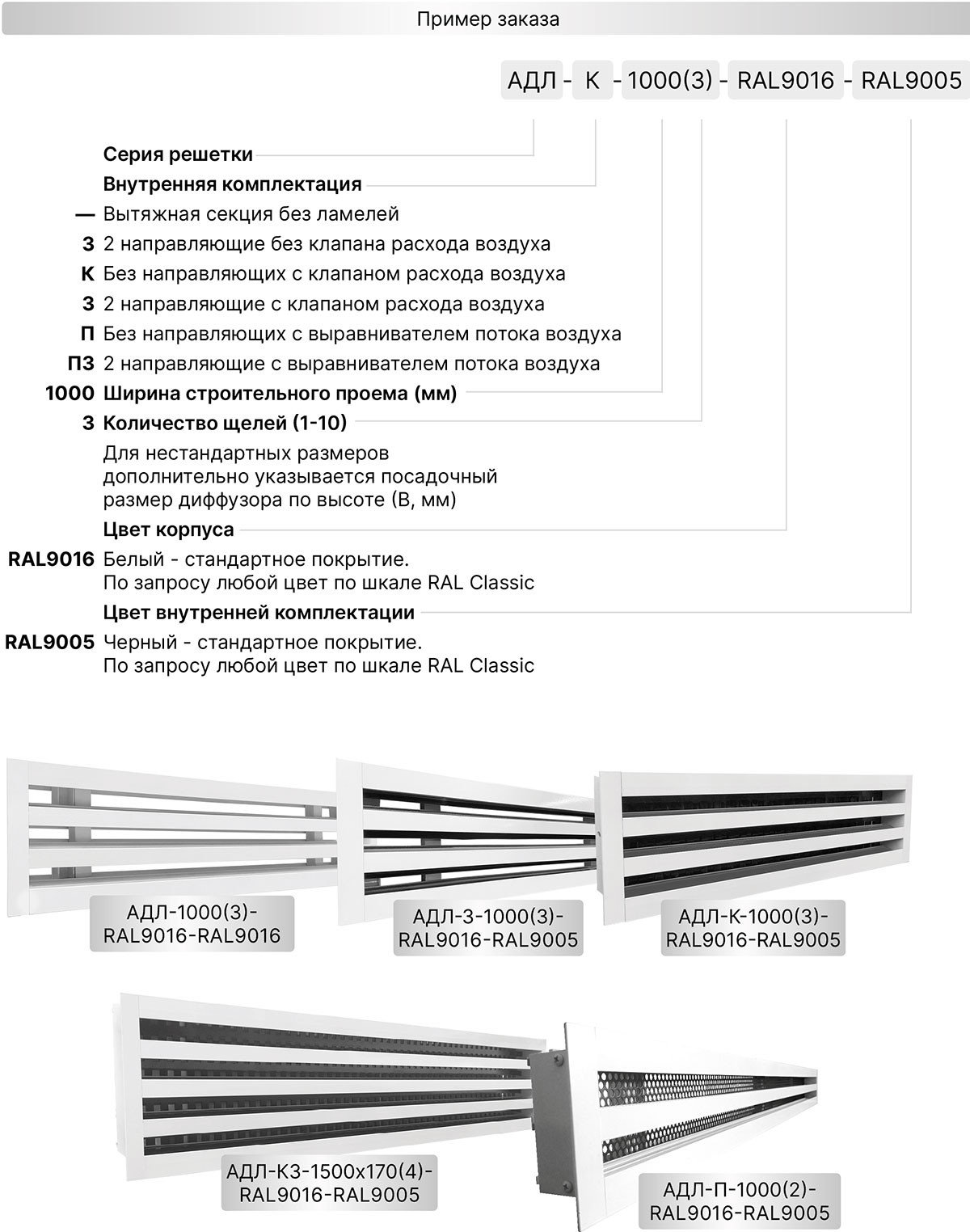 Щелевые решетки АДЛ-К изготавливаются из экструдированного алюминиевого профиля АД31 по ГОСТ 22233-2001. По умолчанию корпус диффузоров окрашивается в стандартный белый цвет RAL 9016, а внутренняя перфорированная кассета в чёрный цвет RAL 9005. По индивидуальному заказу возможна окраска в любой цвет по шкале RAL как корпуса, так и внутренней части.