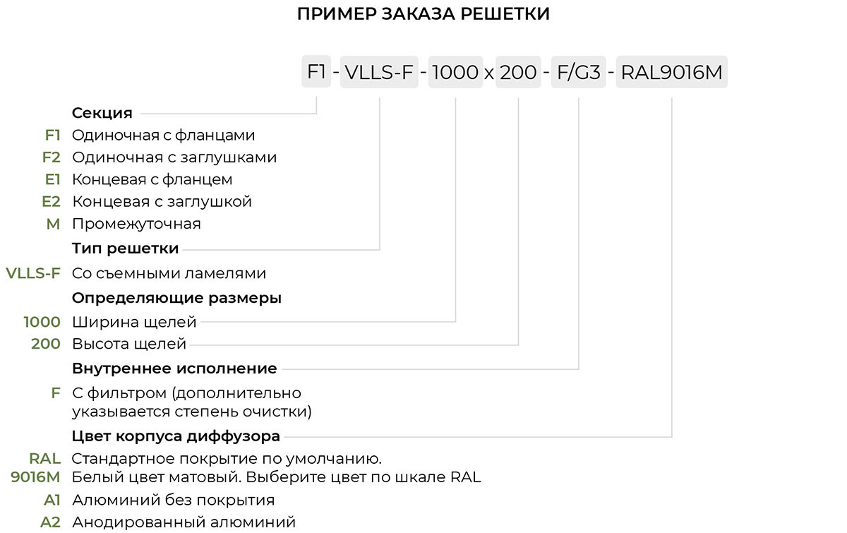 Используемые материалы. Щелевые решетки VLL-F и VLLS-F изготавливаются из экструдированного алюминиевого профиля АД31 по ГОСТ 22233-2018. По умолчанию корпус решетки окрашивается в стандартный белый цвет RAL 9016М матовый, а внутреннее исполнение в чёрный цвет RAL9005М матовый. По индивидуальному заказу возможна окраска в любой цвет по шкале RAL. Статическая камера изготавливается из оцинкованной листовой стали 0,4 - 1,5 мм в зависимости от размера и пожелания заказчика. По умолчанию все изделия поставляются в неокрашенном виде.